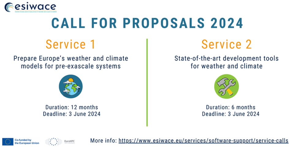 The ESiWACE3 Consortium has opened a new round of Call for Proposals (CfP) to apply for the services provided by the 3rd phase of ESiWACE - Center of Excellence in Simulation of Weather and Climate in Europe. On this occasion, two types of services can be required: