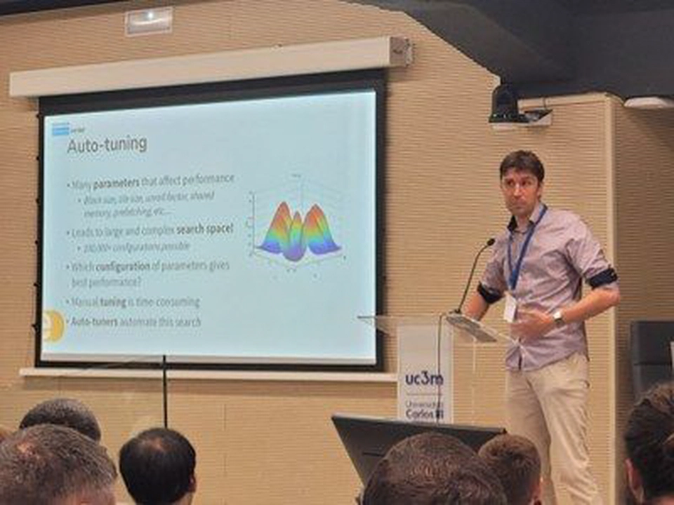 Caption: Stijn Heldens (NLeSC) presenting the work on Auto-tuning during the EuroPar conference.